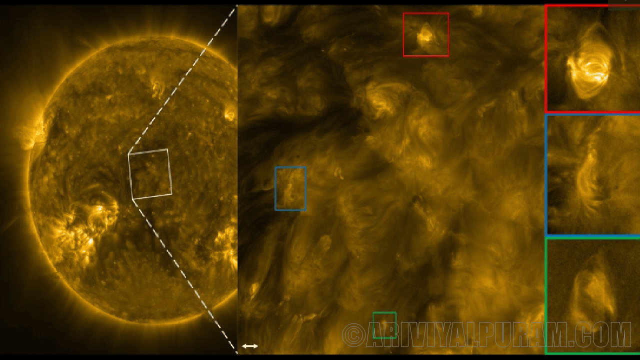 கடந்த ஆண்டு அக்டோபரில் EUI கருவியால் கைப்பற்றப்பட்ட வீடியோ காட்சியில் புதிதாக கண்டுபிடிக்கப்பட்ட கட்டமைப்புகளைக் காணலாம். நீலம், பச்சை மற்றும் சிவப்பு செவ்வகங்களில் சிறப்பிக்கப்படும் காந்த அலைவுகள் ஒவ்வொன்றும் 6,200 மைல்கள் (10,000 கிலோமீட்டர்கள்)க்கும் குறைவான அகலம் கொண்டது. சூழலுக்கு, சூரிய வட்டு 864,000 மைல்கள் (1,392,000 கிமீ) விட்டம் கொண்டது.