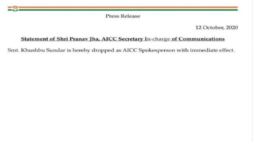 காங்கிரஸ் கட்சியின் தேசிய செய்தி தொடர்பாளர் பதவி பொறுப்பிலிருந்து நடிகை குஷ்பூ அதிரடியாக நீக்கப்பட்டுள்ளார்.
